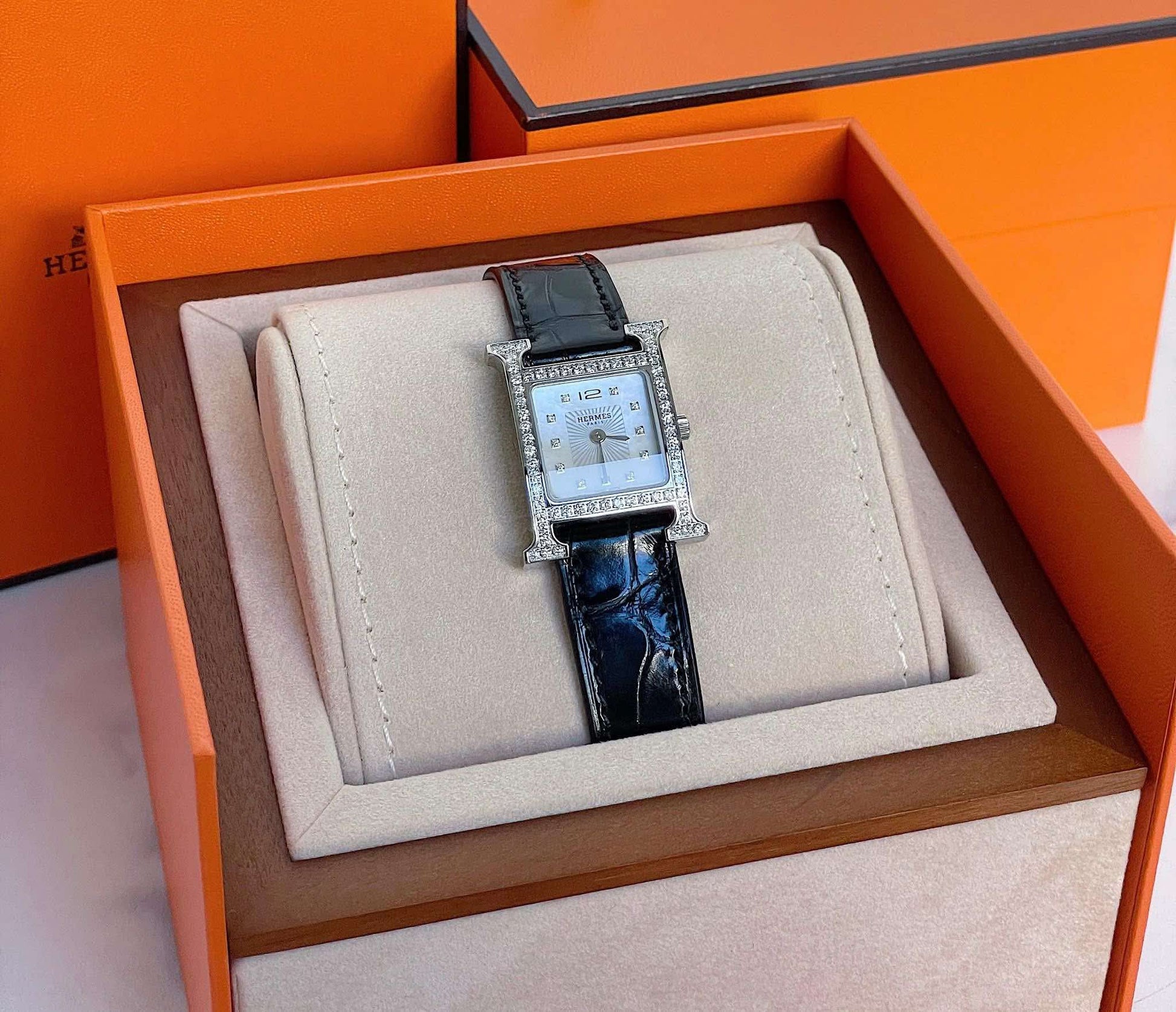 Diamond-set steel watch, quartz movement, diamond-set white mother-of-pearl dial, short interchangeable strap in smooth black alligator